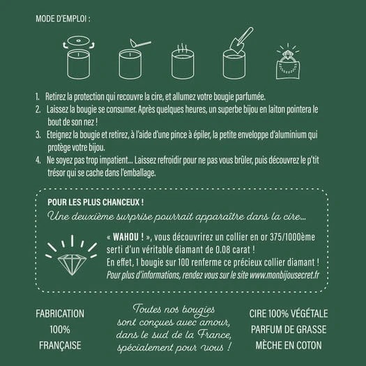 Afin de faire cadeau d’une expérience sensorielle et émotionnelle à chaque personne, nos bougies se déclinent en divers parfums et renferment différents bijoux, dont certains précieux, sertis de véritables diamants !
