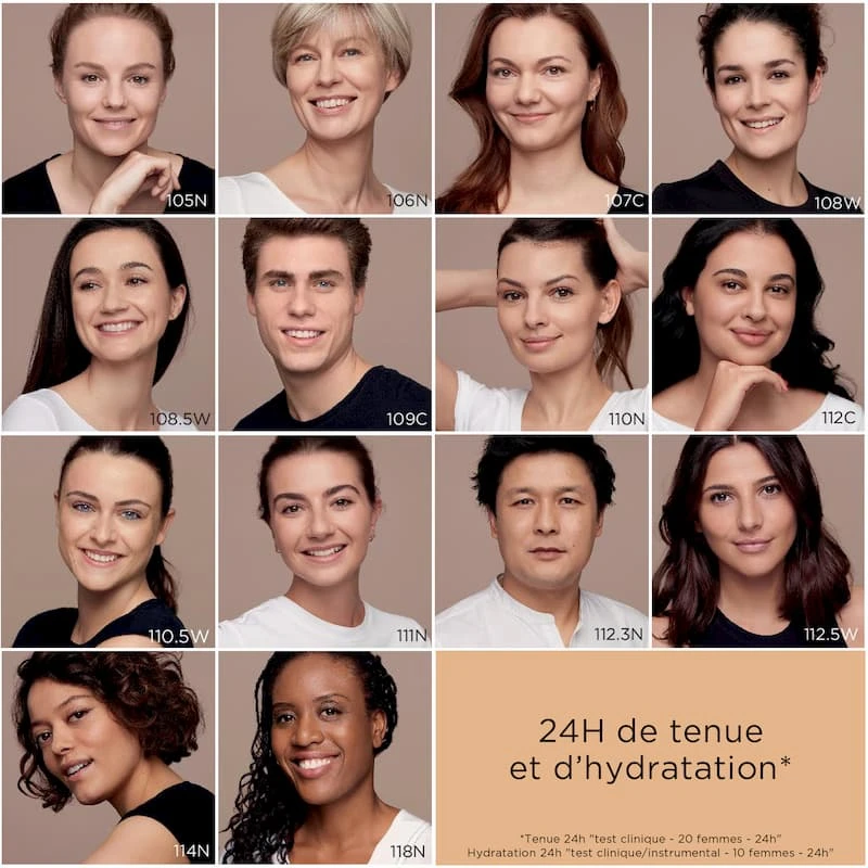 A l’application, le fond de teint ne laisse pas de démarcation ni d’effet masque. Les imperfections sont lissées et camouflées, l’excès de sébum est absorbé, le teint est mat et unifié naturellement.