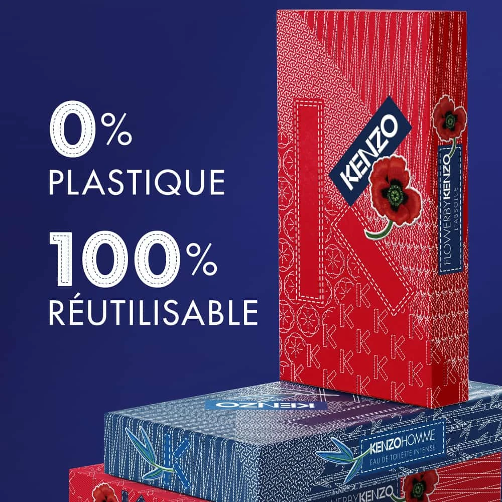 Parce que KENZO PARFUMS s’engage pour un monde plus beau, KENZO HOMME a repensé le design des capots afin d’économiser 34% de plastique et a réduit son poids de verre de 23%, pour contenir 10ml supplémentaires. Ce coffret cadeau est 100% carton recyclé, recyclable et réutilisable. Symbole de l’engagement de Kenzo Parfums, Kenzo Homme Eau de Toilette Intense est composé de 95% d’ingrédients d’origine naturelle (conformément à la norme ISO 16128).