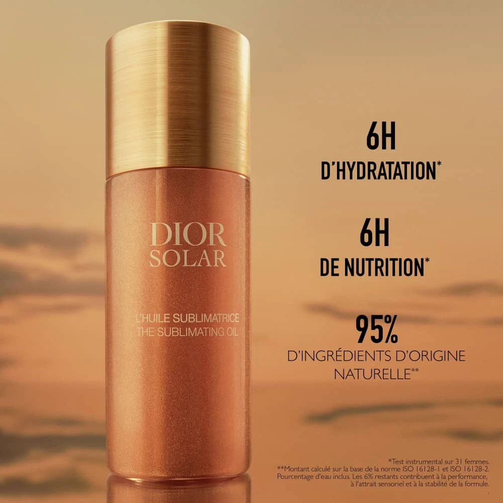 Découvrez l’huile hydratante Dior Solar L’Huile Sublimatrice, une huile perfectrice d’éclat qui vient embellir le bronzage et la chevelure d’un fini ensoleillé tout au long de l’année. Cette huile Dior enveloppe la peau et les cheveux d’un voile parfumé et lumineux.