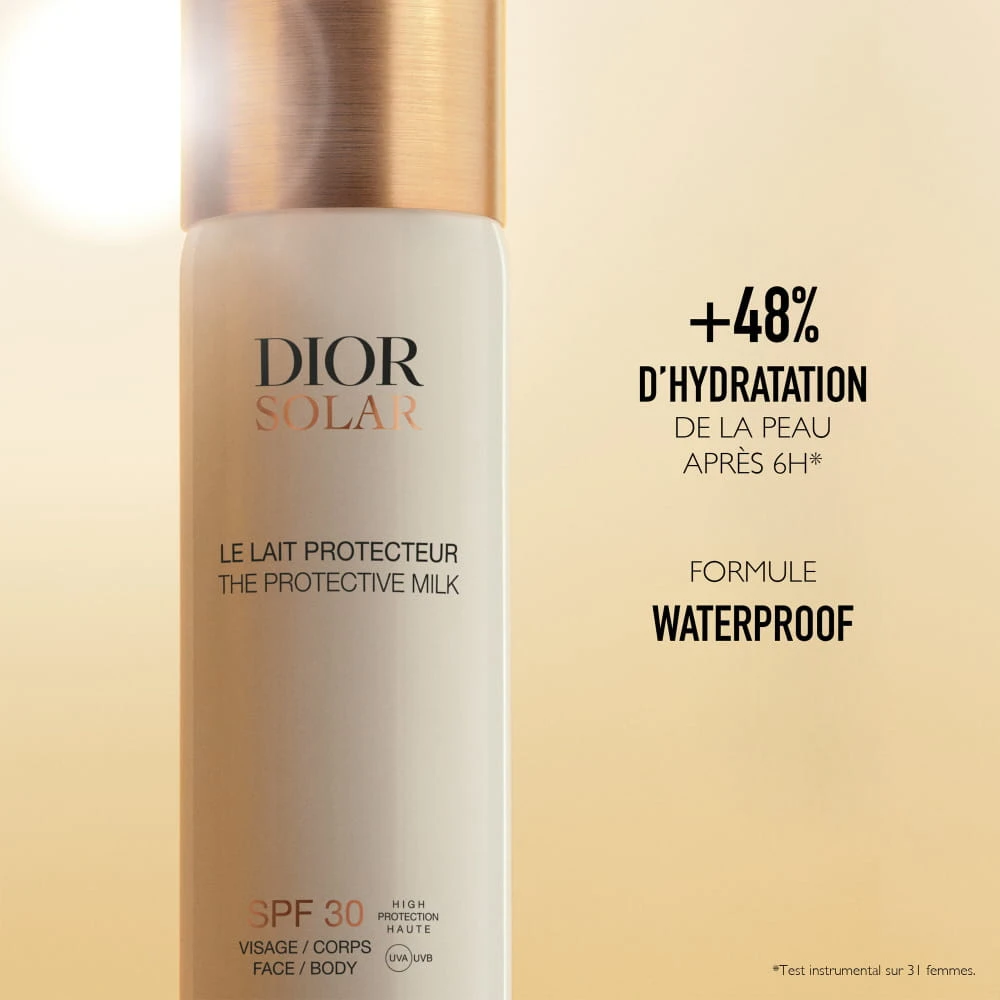 | Bénéfice produit | Facile à appliquer grâce à son spray qui permet une répartition uniforme du lait solaire sur la peau, Dior Solar Le Lait Protecteur Visage et Corps SPF 30 protège la peau contre les rayons UVA/UVB tout en embellissant le bronzage |