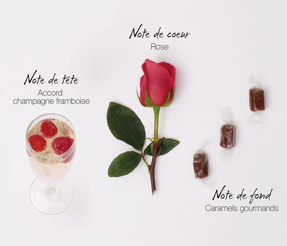 | Composition | Notes de tête : Accord champagne-framboise Notes de cœur : Rose Notes de fond : Caramel gourmand |